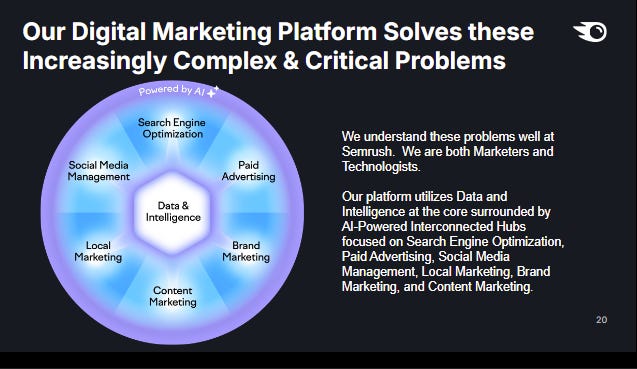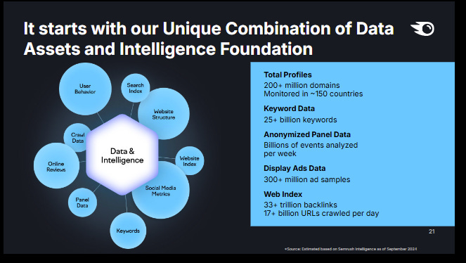 Semrush’s Q1 2025 investor presentation does an excellent job of highlighting how data forms the foundation for a multi-product suite that now expands well beyond traditional SEO.